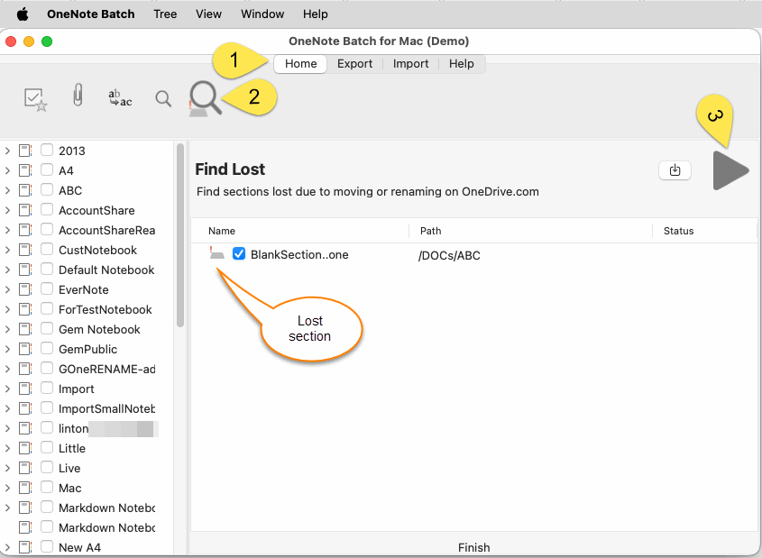 Now, OneNote Batch for Mac provides a feature to find these types of missing sections.