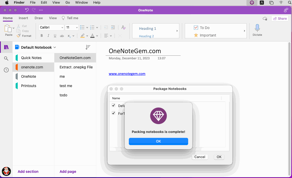Gem Menu for Mac OneNote v18 provides the ability to package notebooks into .gempkg files and recover .gempkg file.