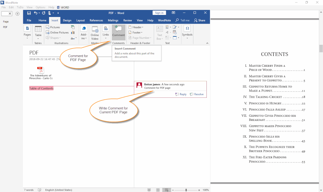 Insert word comment, click the “Insert” tab -> “Comment” feature. It will insert a normal Word comment and you can start annotating the current PDF page.