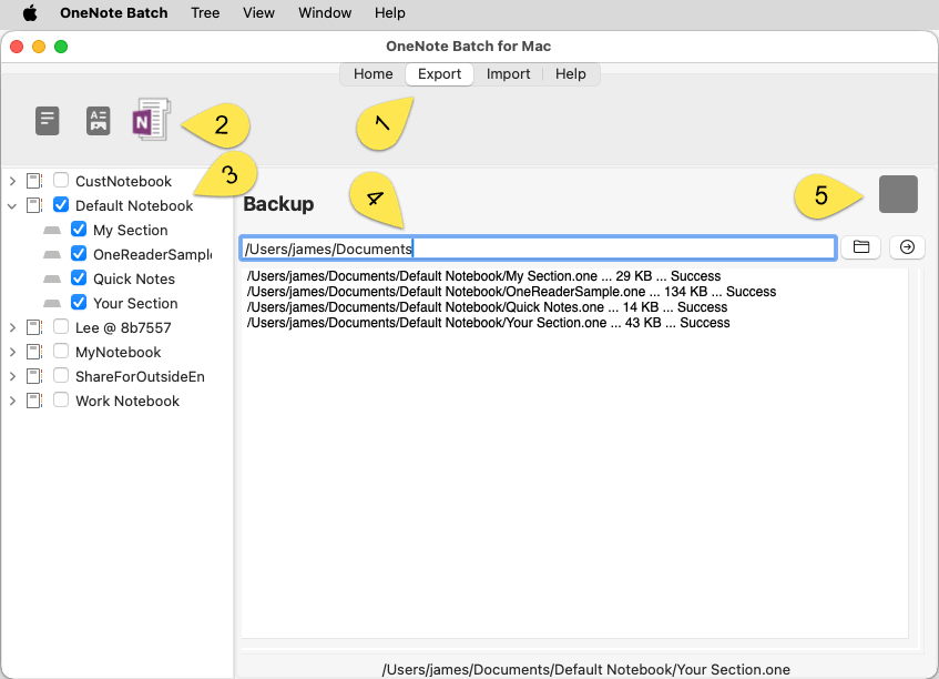 Then, still in OneNote Batch for Mac:- Click Export tab