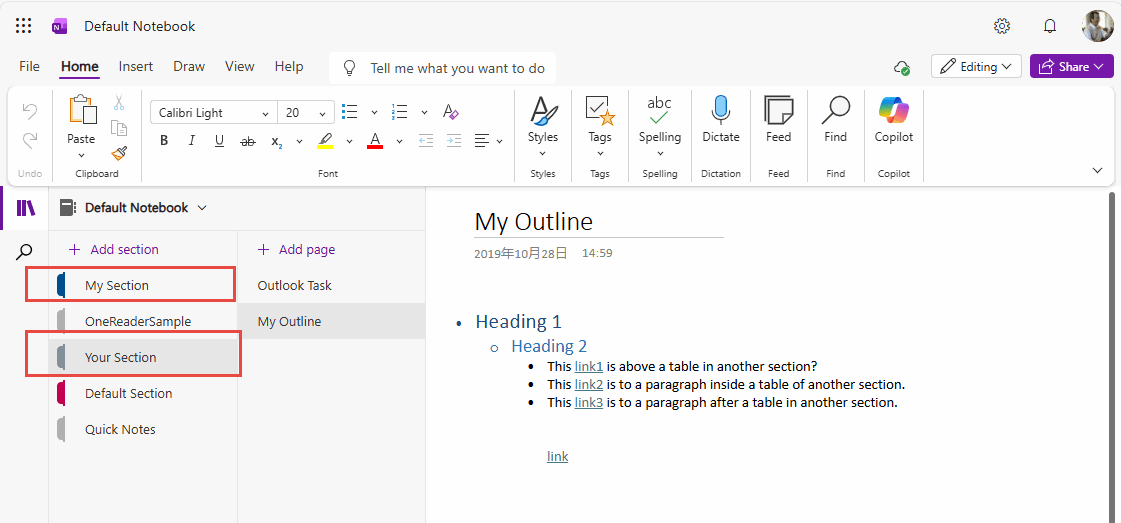 After the recovery is successful, waits for 3 minutes, OneDrive will index the new sections.Reopen the “Default Notebook” with Web OneNote, and you will find “My Section” and “Your Section” appear in the Default Notebook,.