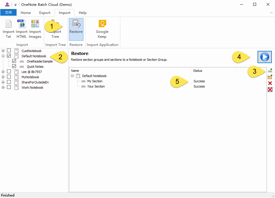 In OneNote Batch Cloud :- Click “Import” tab -> Restore feature.