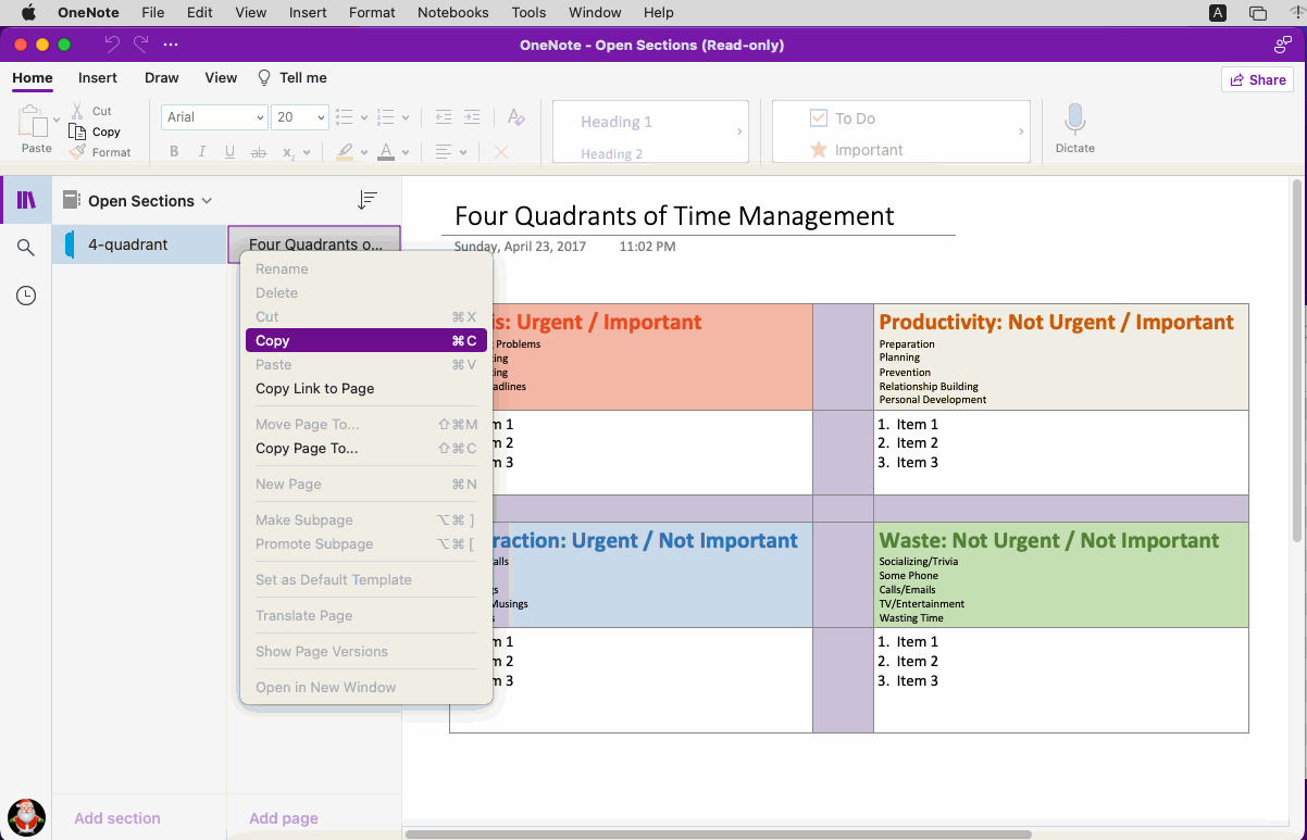 The “4-quadrant” in the “Gem Restore Sections” opened by above steps was placed in the "Open Sections" by OneNote.In this way, when you need to use this template in other notebook, you can go to this 4-quadrant section to copy the “Four Quadrants of Time Management” page to the notebook.